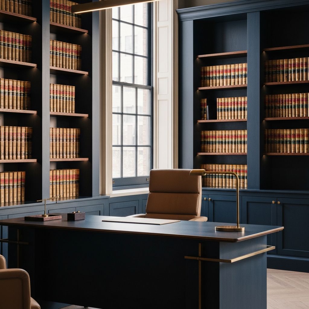 Interior sóbrio e elegante de um escritório de advocacia com estante de livros e luz natural